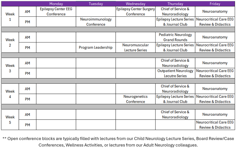The bulk of our education sessions occur at noon throughout the week, though there are additional adult neurology education sessions (ex: neuroanatomy) and divisional case conferences (ex: “Chief of Service”) that occur in the morning each week. Please see below a sample calendar for our recurring monthly educational sessions as well as the “Conferences” tab below for more details.